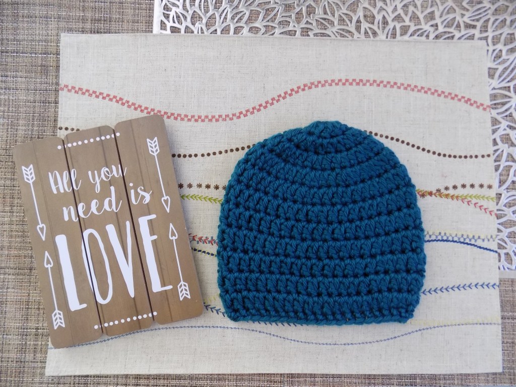 This beanie is made with double crochet stitches with a single crochet edge at the end, using a size 5 (bulky) weight yarn.