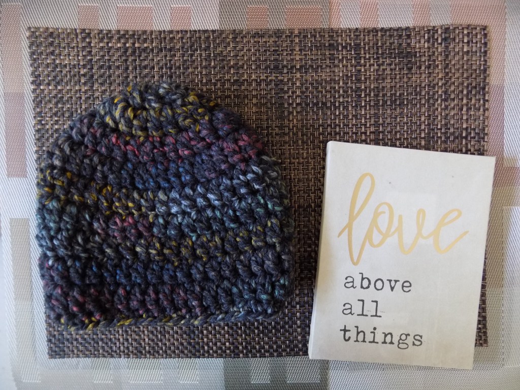 This beanie is made with double crochet stitches and a row of single crochet at the edge with size 6 (super bulky) weight yarn.