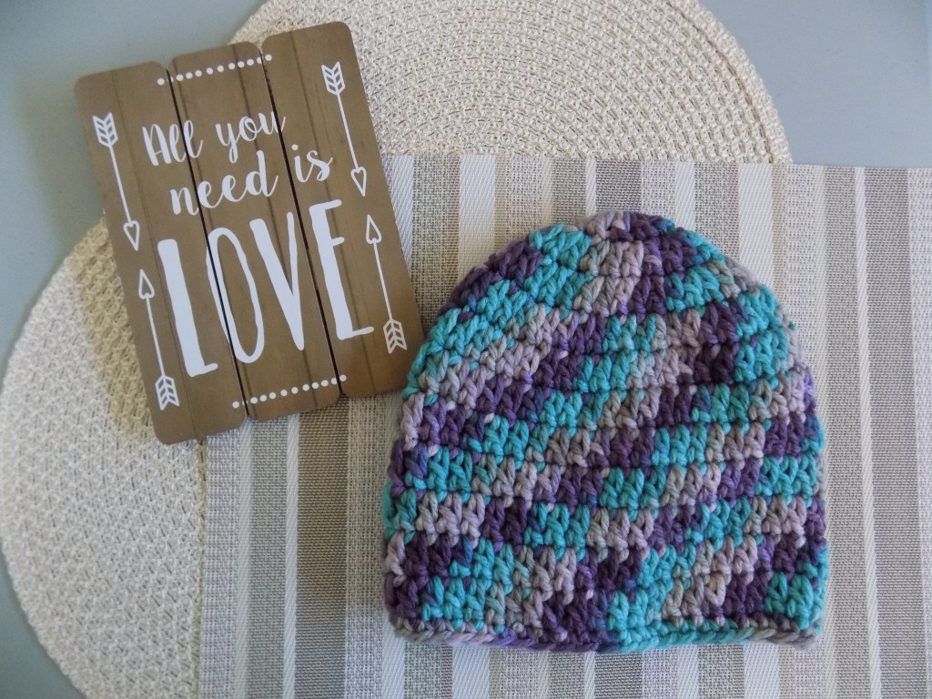 This beanie is made with double crochet stitches and lined with sc at the end.
