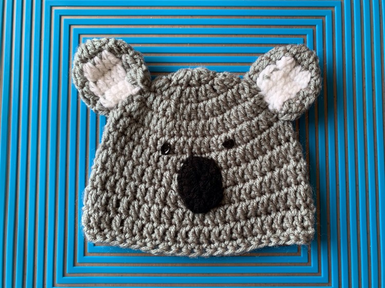 Row 4 – ch 2 ( this counts as your first dc of this round), dc in the next 3 st, CHANGE TO WHITE yarn and dc in the next 5 st, CHANGE TO GREY yarn and dc in the next 9 st. Join with sl st to the first dc and fasten off, leaving a long tail for sewing. (18 dc)