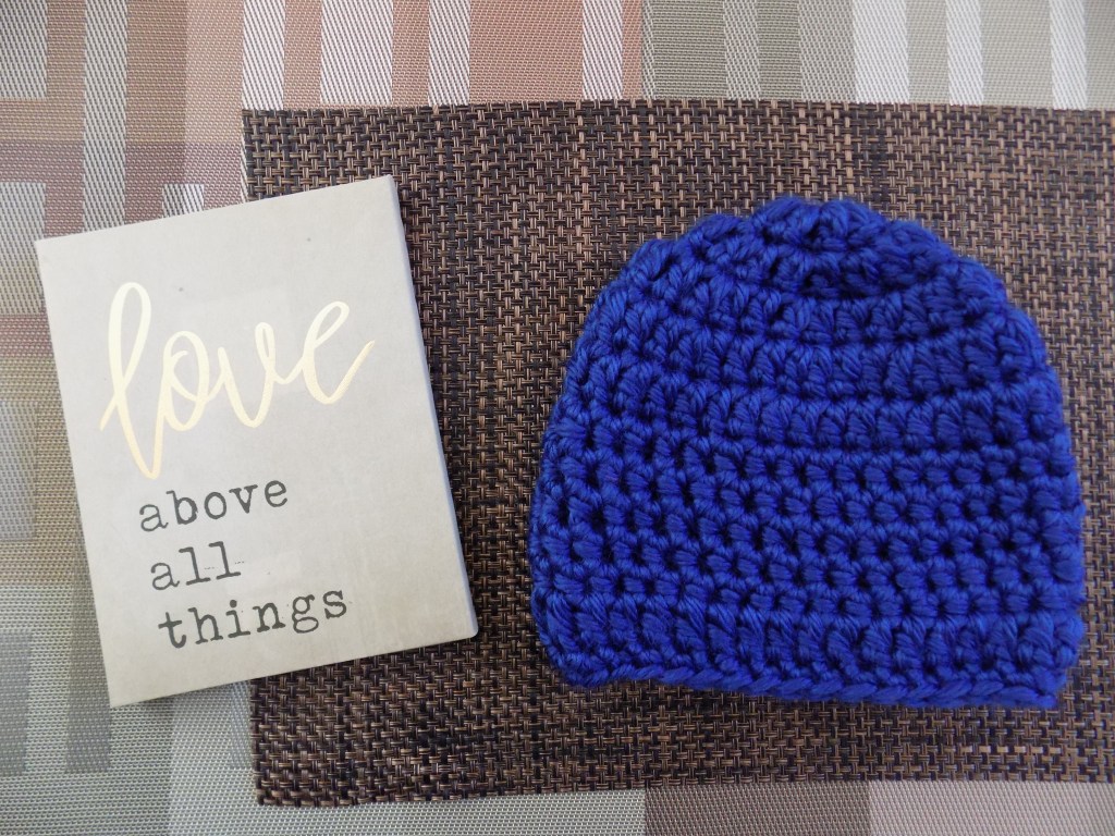 This beanie is made with a band of 5 rows of half double crochet (HDC) stitches in the middle of the beanie using size 6 (super bulky) weight yarn.