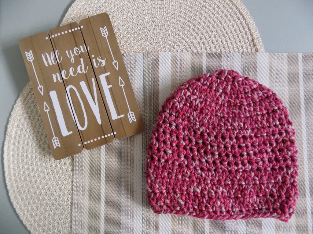 This beanie is made with a band of 5 rows of half double crochet (HDC) stitches in the middle of the beanie.