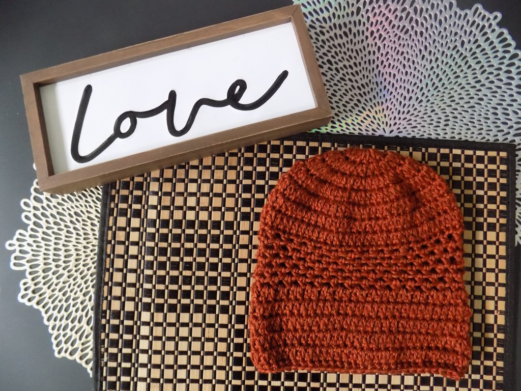 This beanie is made with a band of 6 rows of HDc and ch 1 spaces (to create a mesh like effect) at the center of the hat.