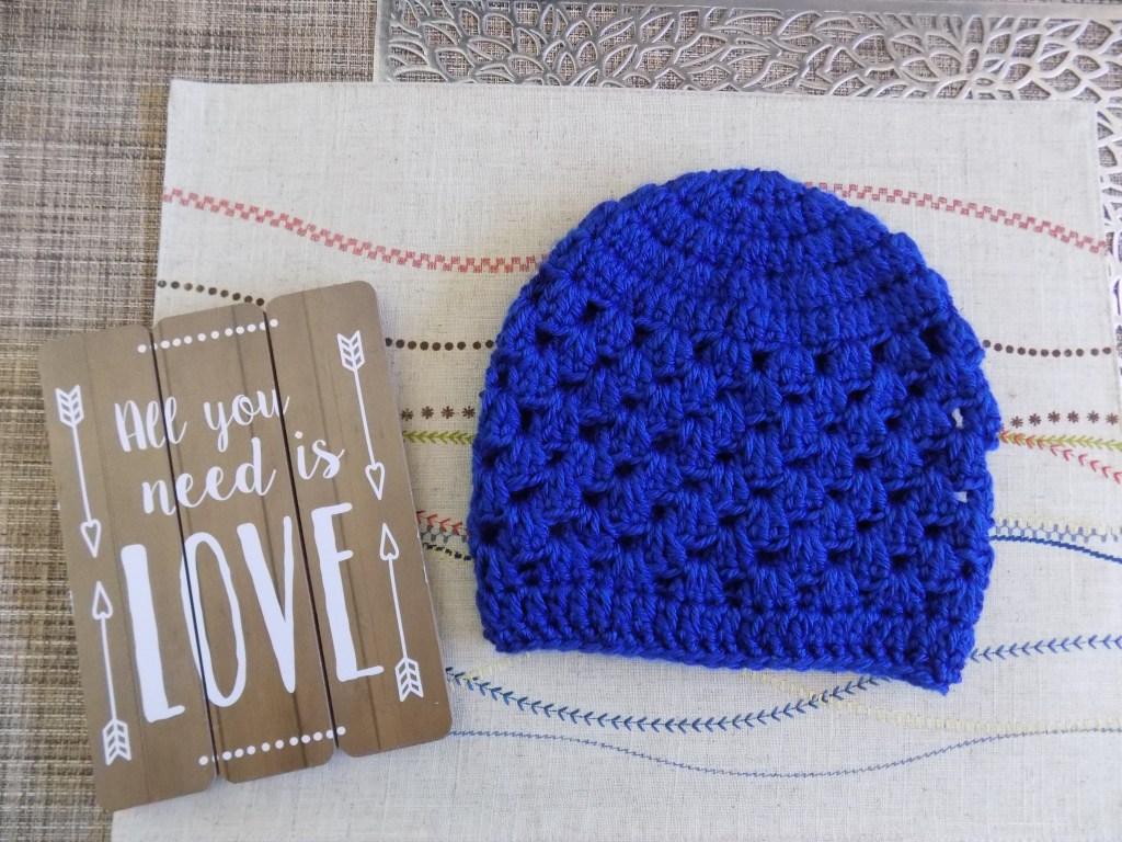 This beanie is made with stitches of a granny square in the body of the hat, using a size 5 (bulky) weight yarn.