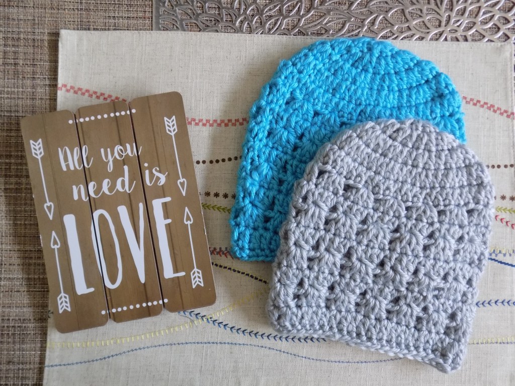This beanie is made with rows of granny square stitches in the body of the hat, rightside up and upside down, creating the shape of an hourglass.