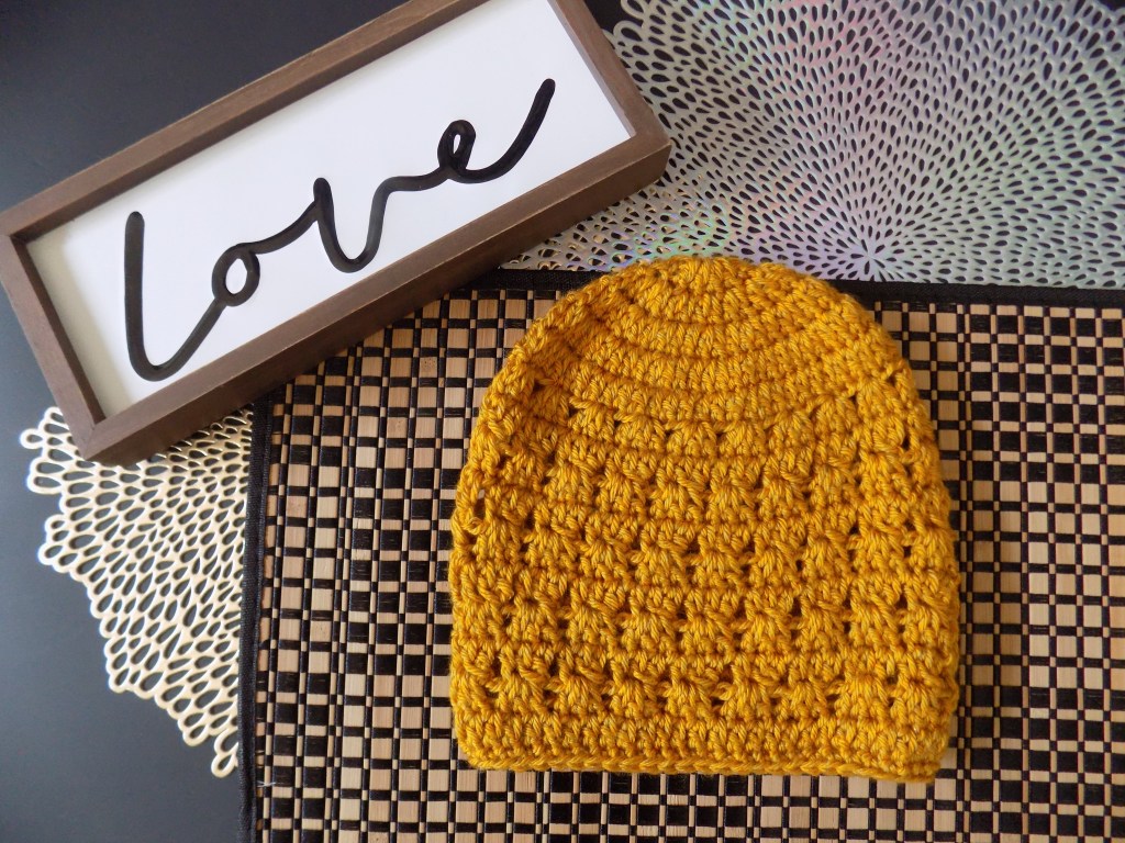 This beanie is made with rows granny square stitches in the body of the hat, alternating rightside up and upside down, to create an hourglass shape