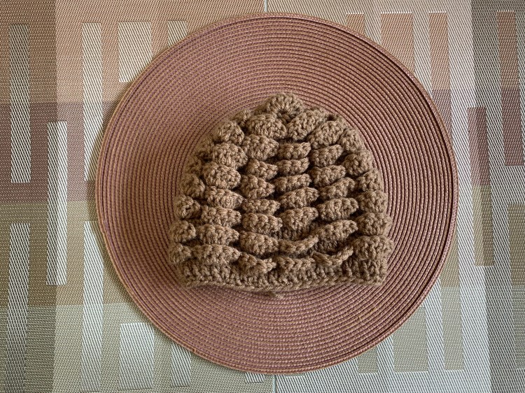 Row 2 – ch 2 (this counts as your first sc of this row), working on the front loops of the st below, 3 shells all the way around.