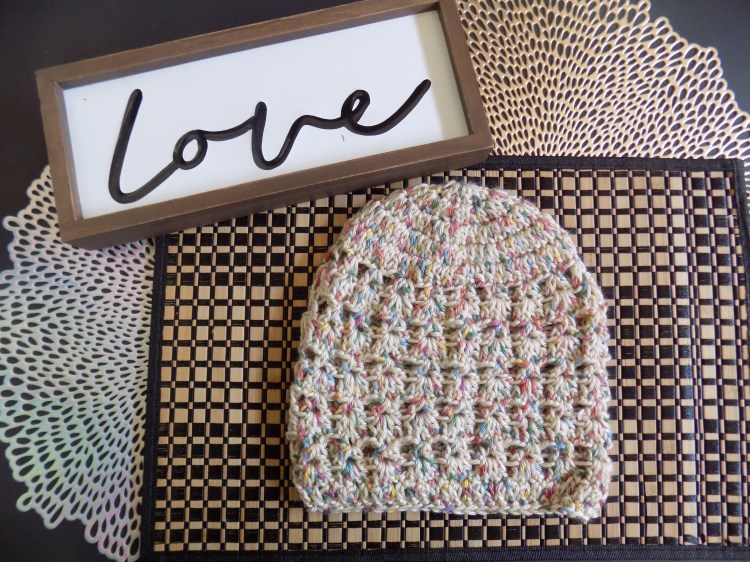 This beanie is made with alternating rows of V stitch and Double V stitch in the body of the hat.