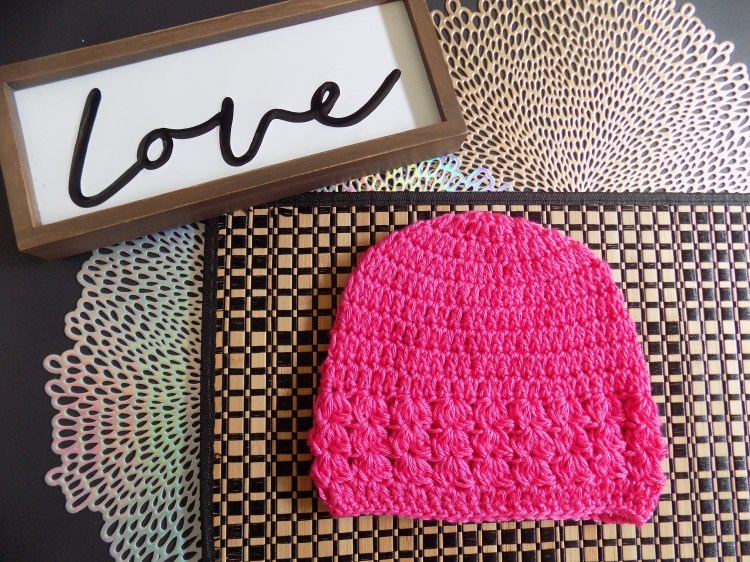 This beanie is made with a band of rows of Puffed V stitch at the cuff of the hat.