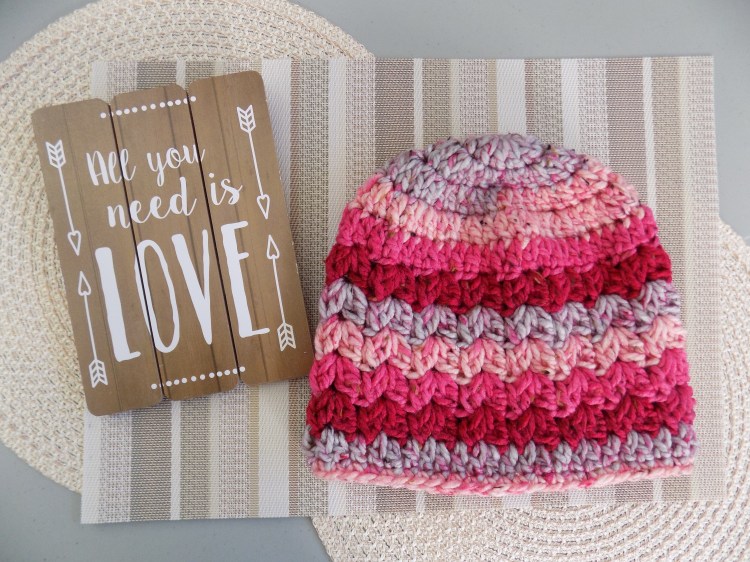 This beanie is made with rows of skinny puff V stitches in the body of the hat. Skinny puff stitches work better for bulky yarns.