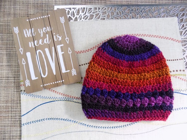 This beanie is made with rows of Puff stitches at the cuff of the hat.