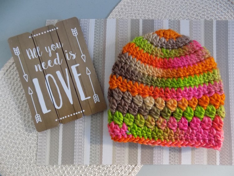 This beanie is made with rows of skinny puff stitches at the cuff of the hat. Skinny puff stitches work better with those super bulky yarns.