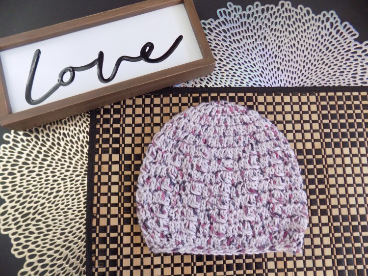 This beanie is made with Rows of Puff stitches down the body of the hat.