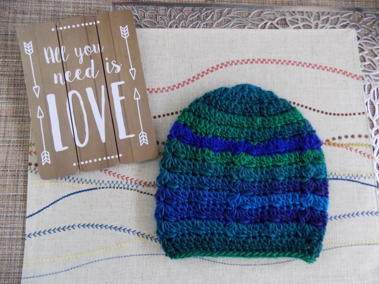 This beanie is made with Rows of Puff V and Puff stitches down the body of the hat.
