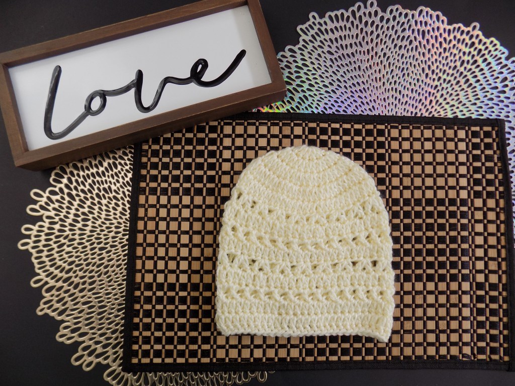 This beanie is made with rows of v stitches (v or peace) and criss cross stitches (x or love) the body of the beanie.