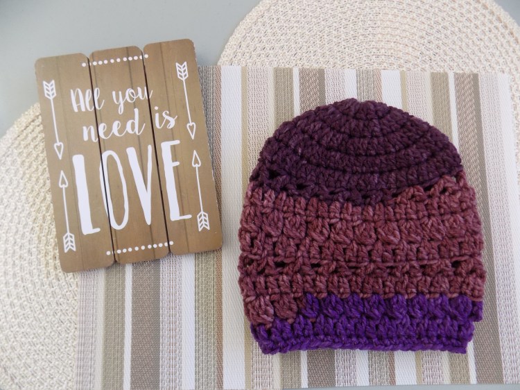 This beanie is made with rows of v stitch (peace) and puff stitches (hugs) the body of the beanie.