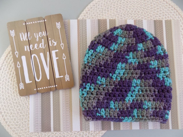 This beanie is made with rows of half double crochet increasing through the body of the hat.