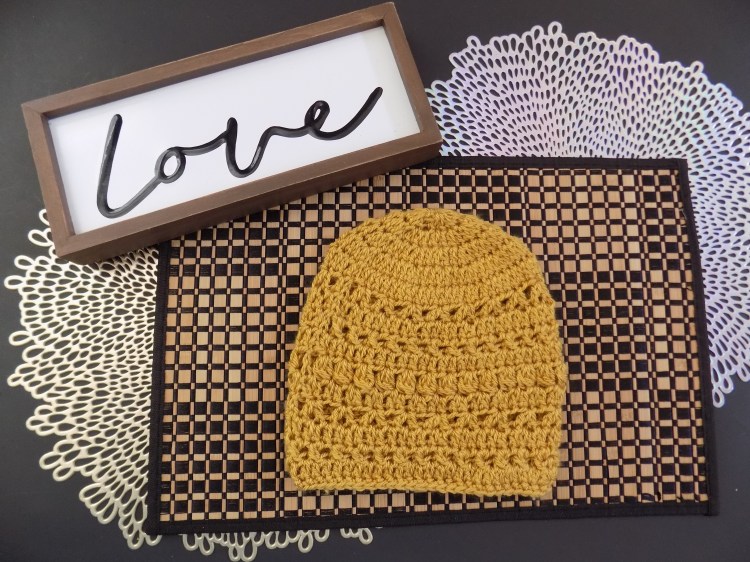 This beanie is made with rows of v stitch (peace), criss cross stitch (love), and puff stitches (hugs) the body of the beanie.