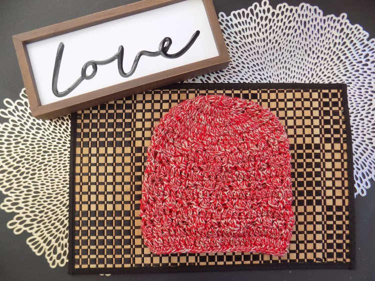 This beanie is made with v stitch (peace), criss cross stitch (love), and puff stitches (hugs) side by side in rows over the body of the beanie.