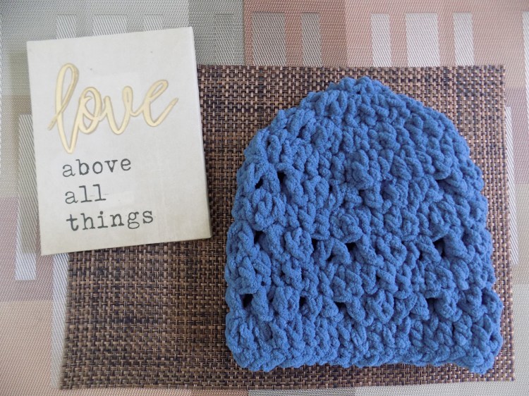 This beanie is made with v stitch (peace), criss cross stitch (love), and puff stitches (hugs) side by side in rows over the body of the beanie.