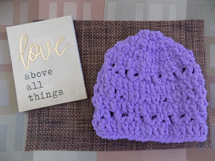 This beanie is a variation of our peace, love, and hugs beanie, where you have rows of v stitch (peace) and criss cross stitch (love), criss cross stitch (love) and puff stitches (hugs), OR criss cross stitch (love) and puff stitches (hugs), v stitch (peace) and puff stitches (hugs) OR v stitch (peace) and criss cross stitch (love), v stitch (peace) and puff stitches (hugs) over the body of the beanie.
