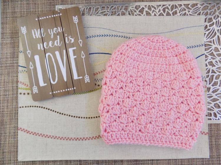 This beanie is made with v stitch (peace) and puff stitches (hugs) the body of the beanie. Our original peace and hugs beanie features separate peace and hugs stitches in rows. This variation has the peace and hugs stitches intertwined together.