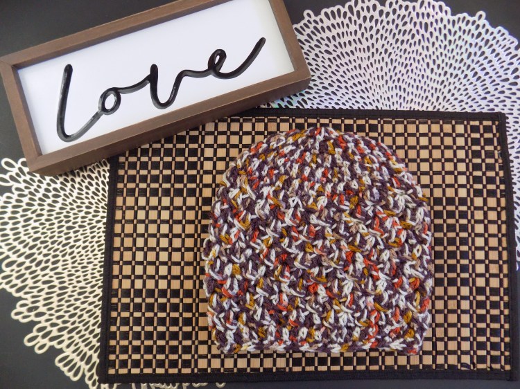 This beanie is made with v stitch (peace) and puff stitches (hugs) the body of the beanie. Our original peace and hugs beanie features separate peace and hugs stitches in rows. This variation has the peace and hugs stitches intertwined together.