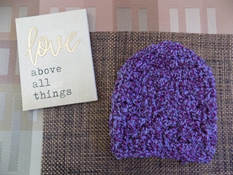 This beanie is made with v stitch (peace) and puff stitches (hugs) the body of the beanie. Our original peace and hugs beanie features separate peace and hugs stitches in rows. This variation has the peace and hugs stitches intertwined together.