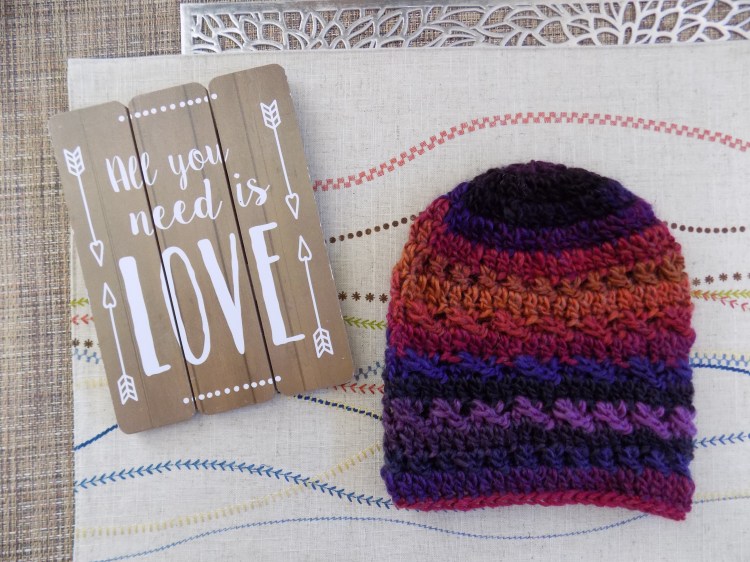 This beanie is made with rows of single, double, and triple Criss Cross stitches alternating with rows of double crochet stitches in the body of the hat.