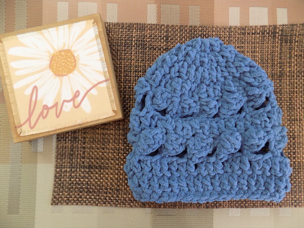 This beanie is made with rows of wave and double crochet stitches in the body of the hat.