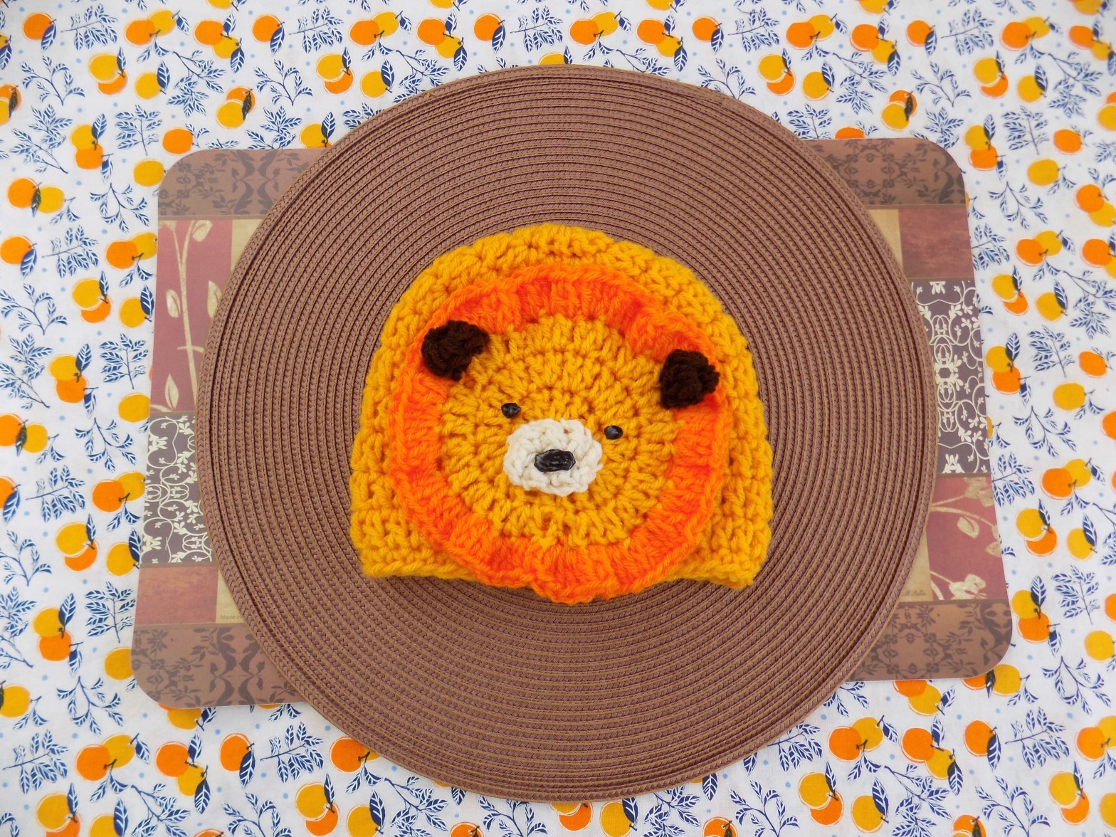 Stitches used: ch- chain sc – single crochet dc – double crochet sl st – slip stitch st – stitch Using size 4 yarn (worsted or medium weight yarn) with a J-10 (6.0 mm) needle BEANIE (6.5” high and 15” flat diameter) Using GOLDEN colored yarn, Ch 4 and loop to make a magic ring.Continue reading “Lion Beanie”